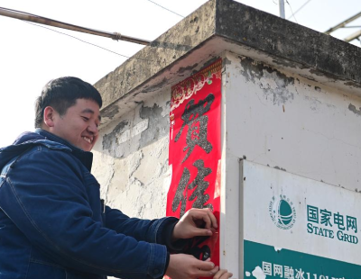1月28日,国网宝鸡供电公司输电运检中心秦岭输电运维班成员赵鹤在变电站张贴新春对联。陕西省宝鸡市凤县的秦岭深处坐落着一座特殊的“融冰”电站——110千伏秦岭融冰变电站。由于当地处在冷暖气流交汇带,雨雪天气极易导致输电线路覆冰。